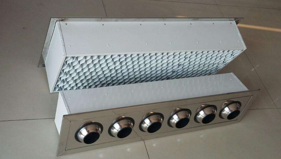 射流消聲風(fēng)口是指將射流部件,即具有消聲功能的射流部件消聲體,按照一定的間距和排數(shù)安裝在矩形(或狹縫形)和圓形殼體內(nèi),形成矩形和圓形消聲風(fēng)口?;蛘邔⑸淞鹘M件消音體和照明燈組合在一起,形成集供氣、消音和照明三大功能于一體的燈式消音風(fēng)口。它由中國(guó)兵器工業(yè)第205研究所開發(fā),并獲得國(guó)家專利。